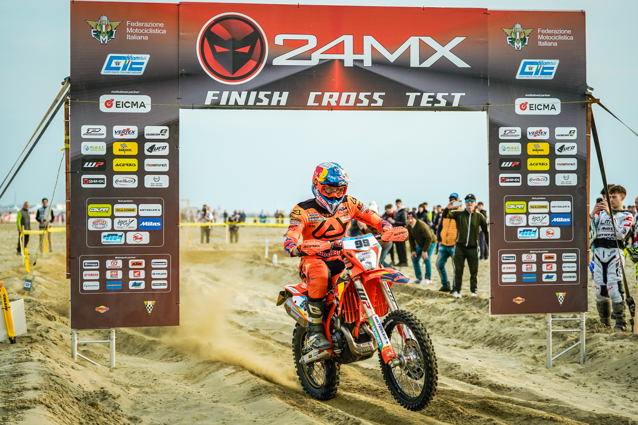 Una bella sfida con un folto pubblico assiepato ovunque sulla spiaggia di Viareggio ad assistere a uno spettacolo di altissimo livello, con i piloti più che mai intenzionati a dimostrare, e a provare prima di tutto a loro stessi, la loro preparazione, il loro livello e come sempre, il loro amore, o odio, verso la sabbia. Pochi i colpi di scena, a parte un tuffo di Samuele Bernardini – per fortuna senza grosse conseguenze fisiche – che ha portato però il pilota Honda Red Moto Racing a chiudere in 14. posizione. Brad Freeman (Beta- Beta Factory Team) è settimo con un complessivo di 2’30”87 e precede Matteo Cavallo (TM – TM Boano Racing) di un battito di ciglia, 19 centesimi. A chiudere l’assoluta dei primi dieci Steve Holcombe (Sherco) a 5 centesimi da Cavallo e Gianluca Martini (KTM – MC Sebino) decimo con poco più di 7 secondi dal vincitore.